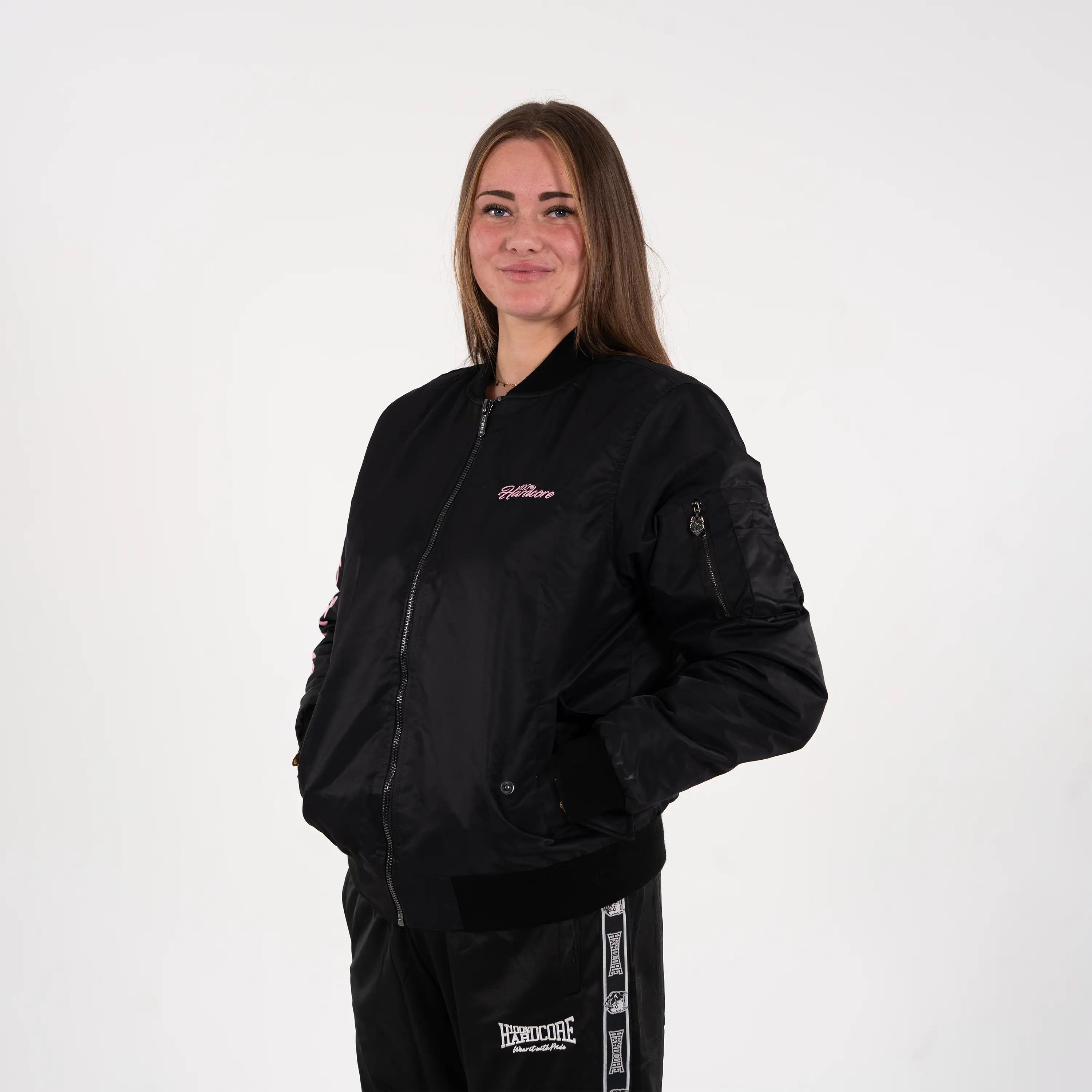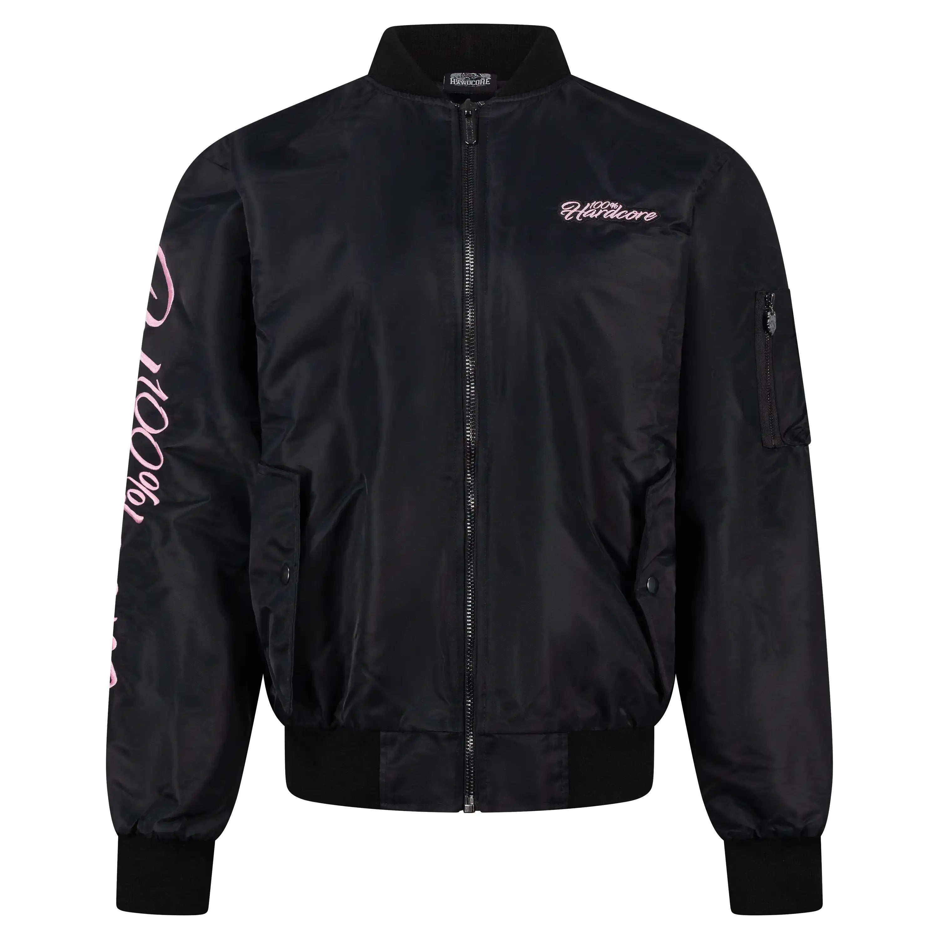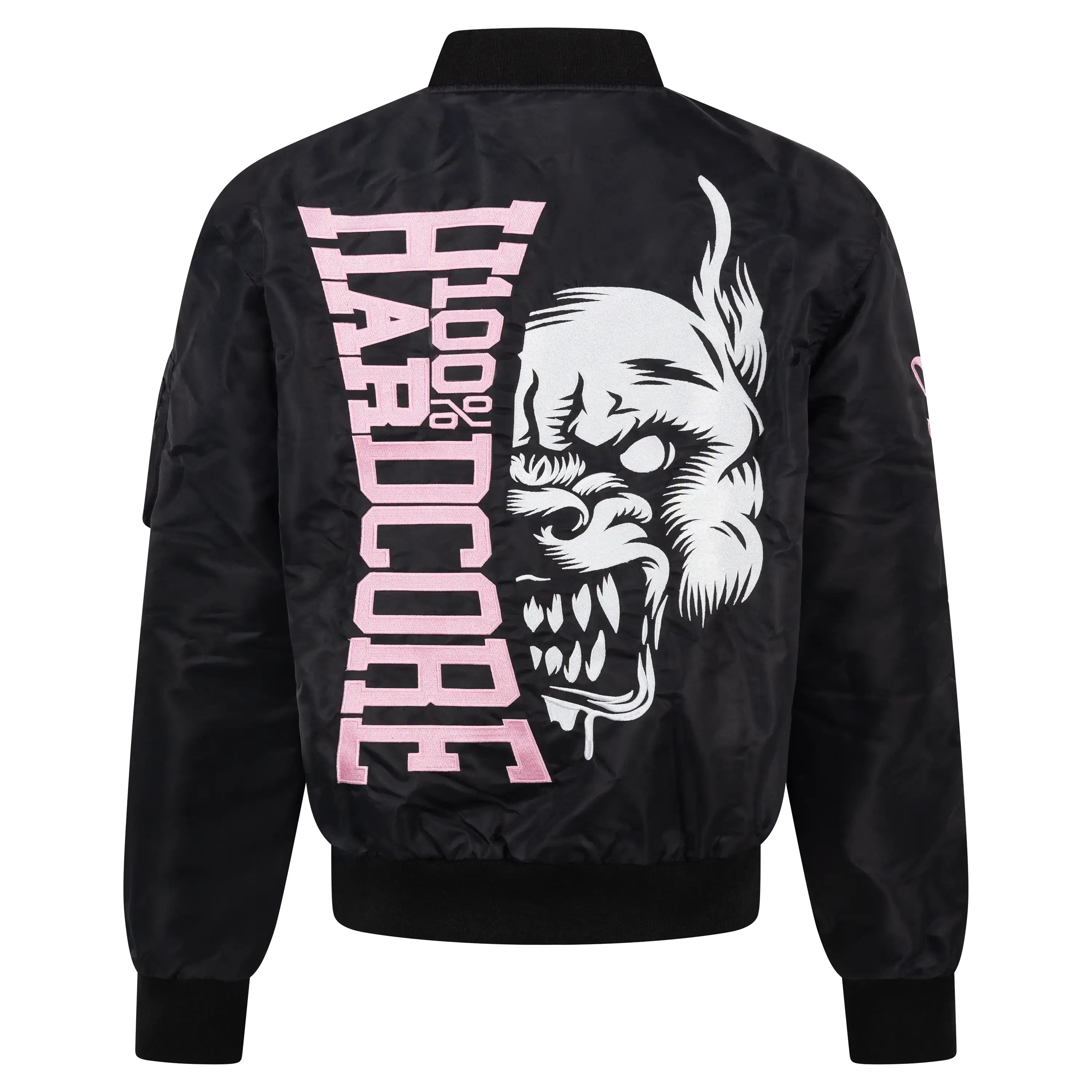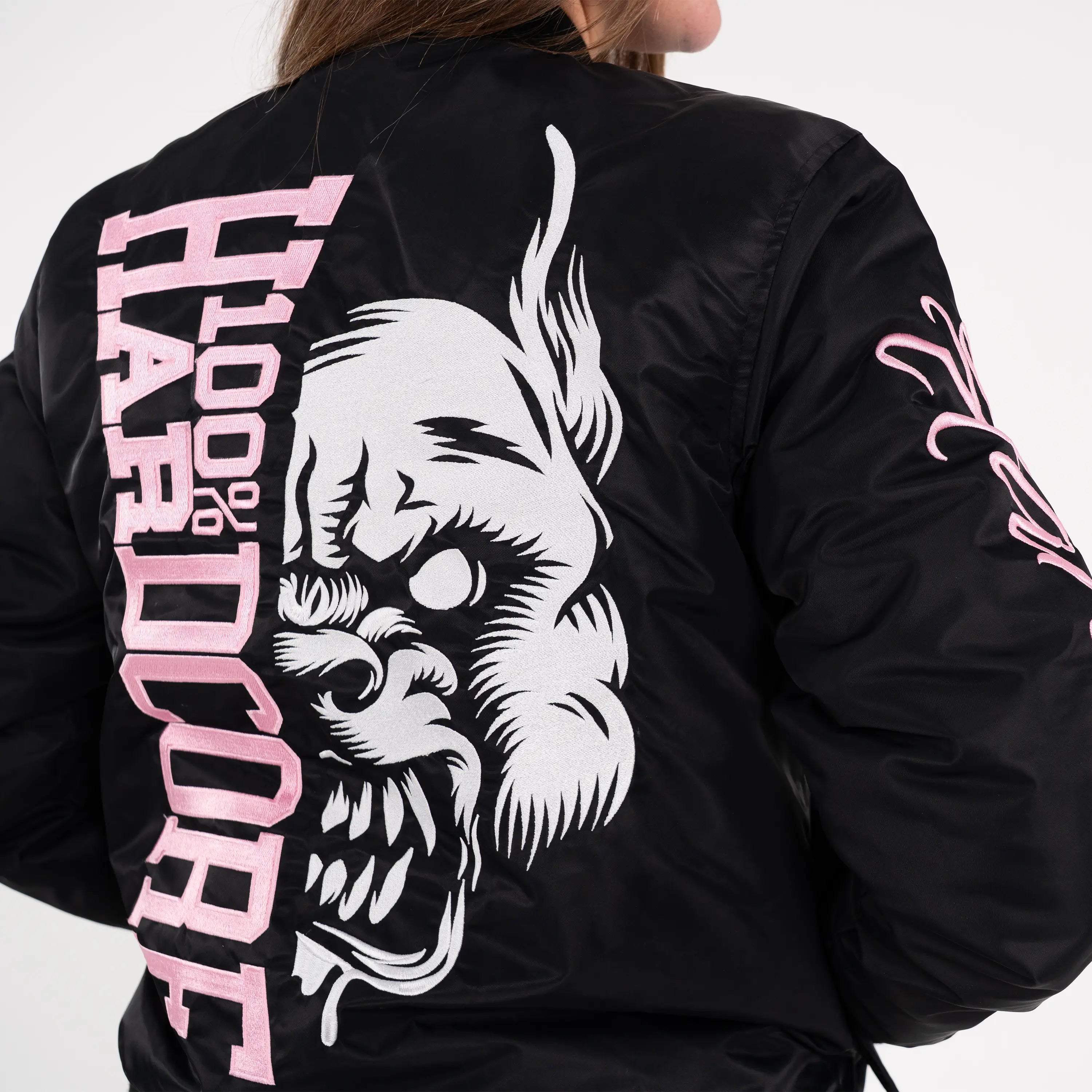 Stand out in true gabber style with the 100% Hardcore Women’s Bomberjacket Branded Rage. This premium black jacket features bold pink details and the iconic Branded Rage artwork embroidered and printed on the back, sleeves, and chest.