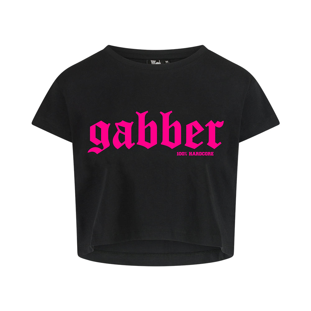 The Gabber Cropped T-shirt Black / Pink is a bold piece from the 100% Hardcore Woman collection. The front features the striking pink “gabber” print in gothic style, making it stand out as a statement for true ravers.
