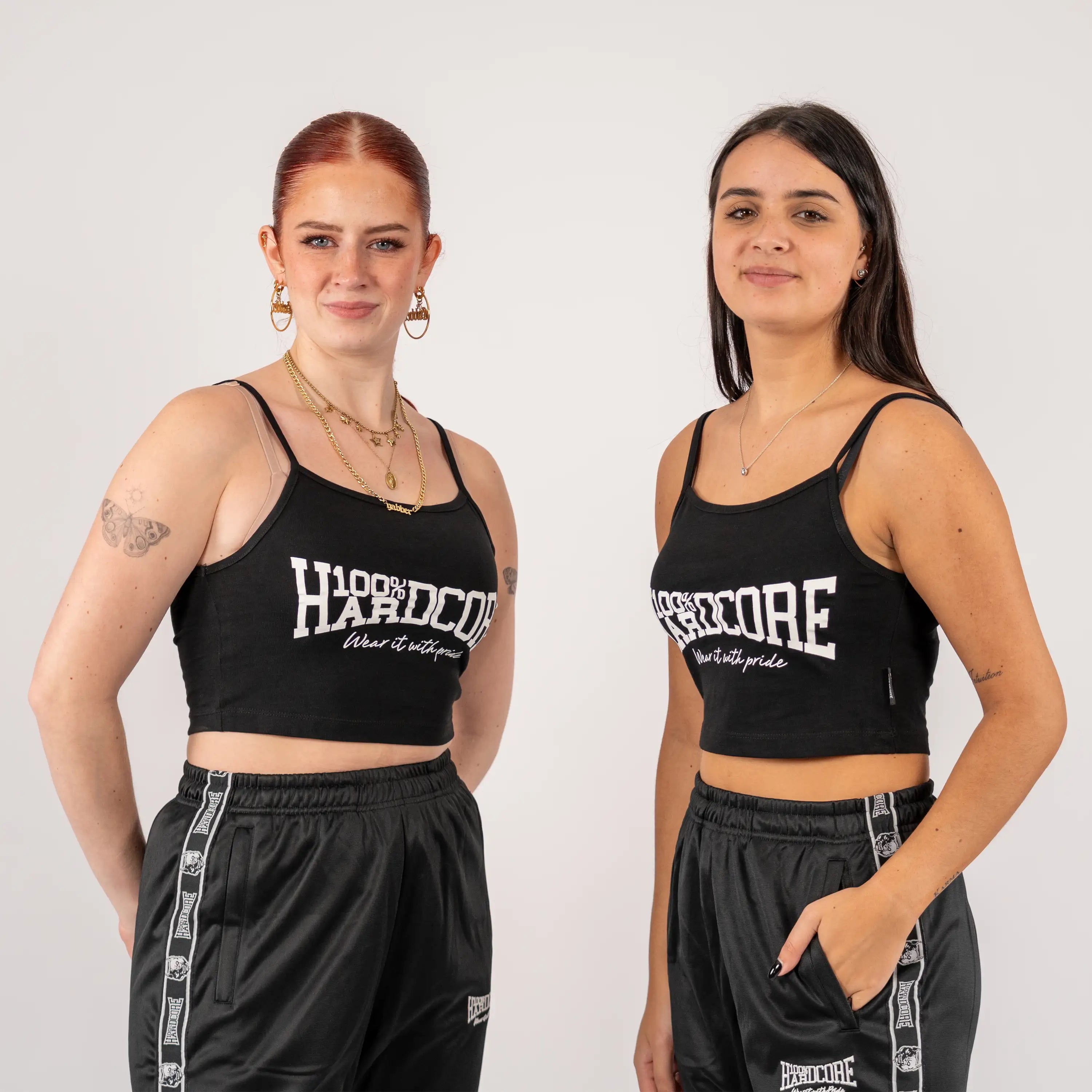 The 100% Hardcore Crop Top Black is a must-have from the 100% Hardcore Woman collection. The front features the bold 100% Hardcore logo with the “Wear it with pride” slogan, making this top a true statement piece.