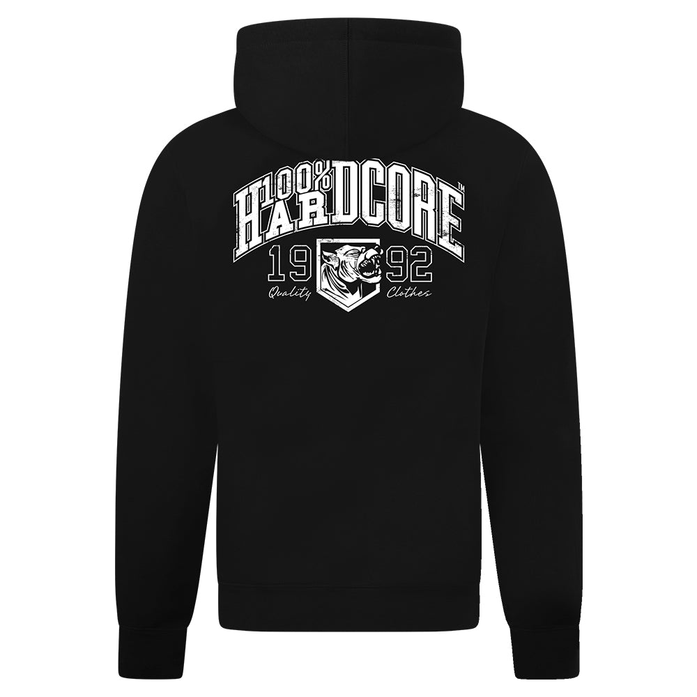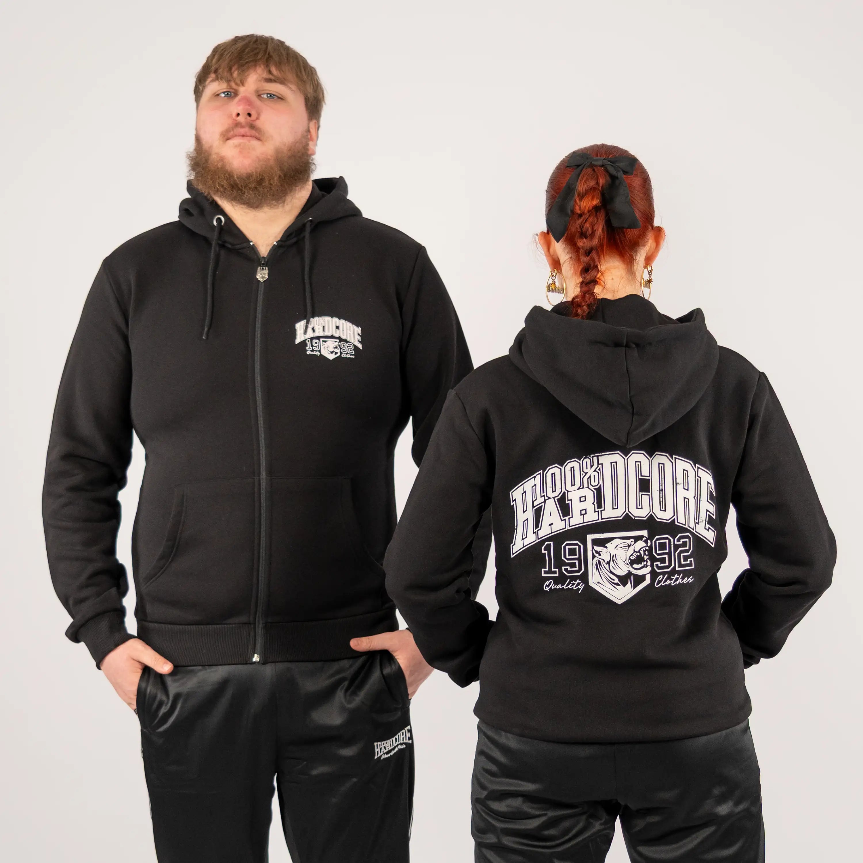 Esta clásica sudadera negra con cremallera luce el llamativo logotipo de 100% Hardcore 1992. Un homenaje al espíritu gabber original. Diseñada para ofrecer comodidad y durabilidad, es perfecta para el día a día o para tu próximo evento hardcore.