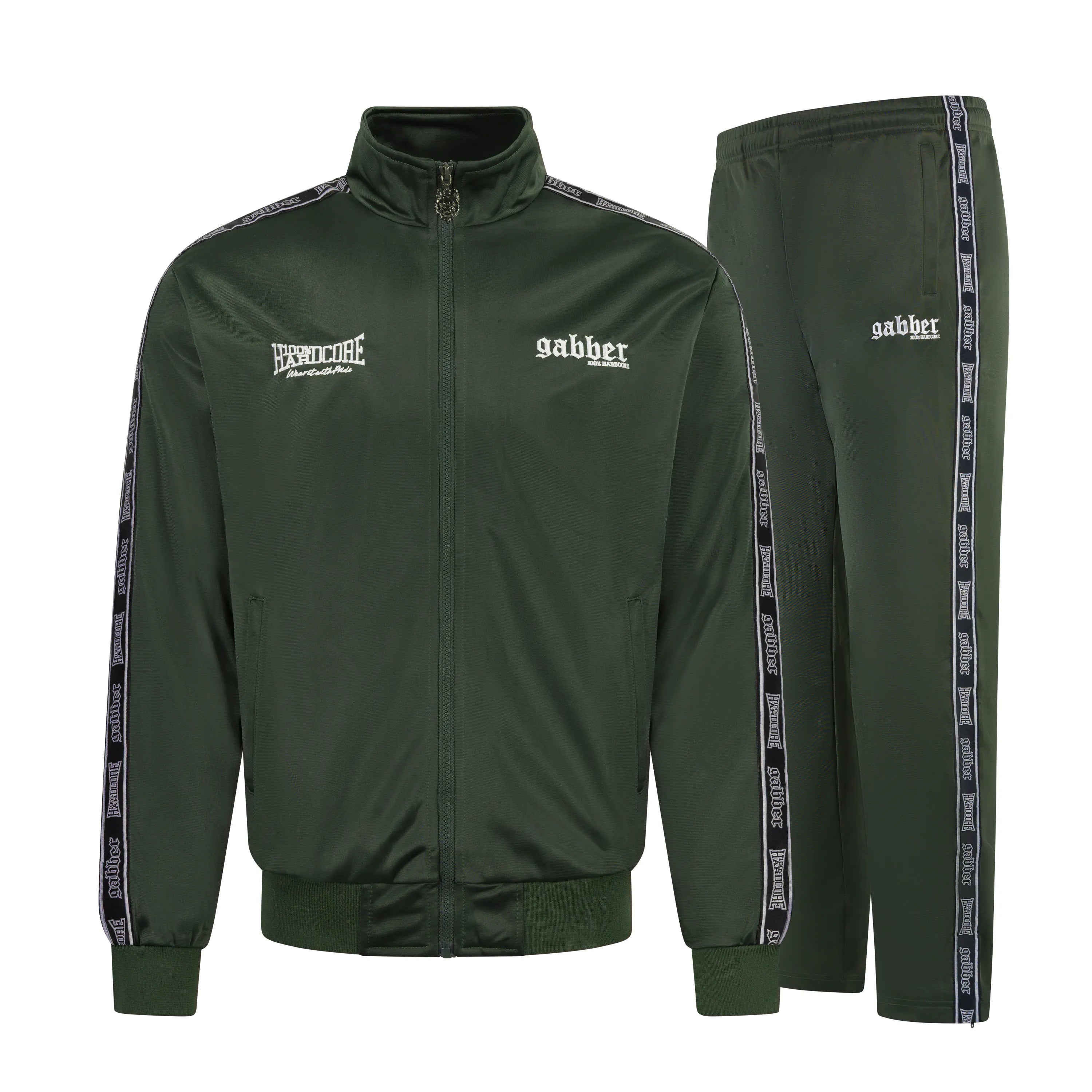 El chándal Gabber en verde militar combina la chaqueta y el pantalón de entrenamiento a juego en un conjunto atrevido. Confeccionado en tejido cómodo y resistente con detalles de cinta tejida, ambas prendas lucen llamativos estampados de logotipos. Elige tu talla de chaqueta y pantalón por separado para un ajuste perfecto.
