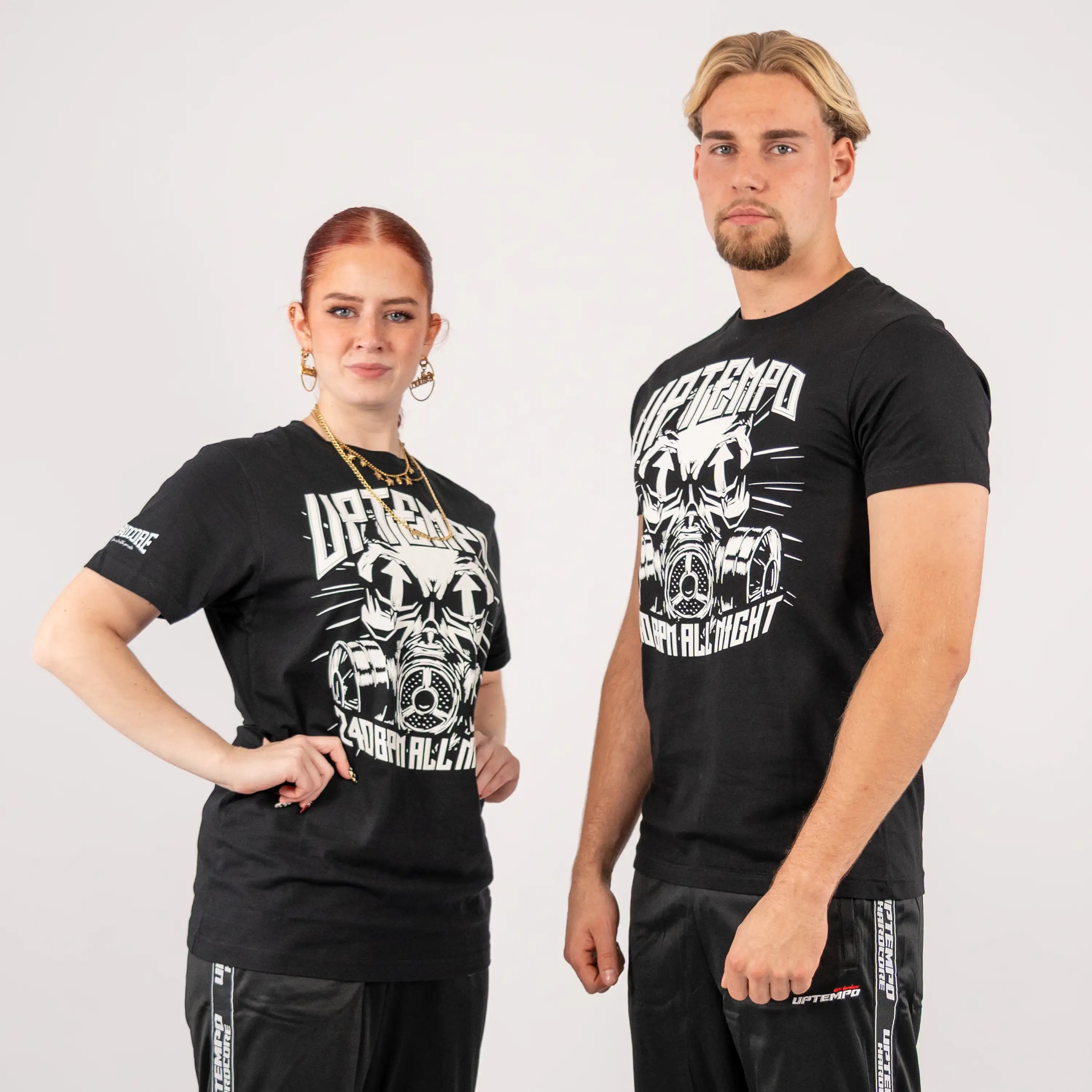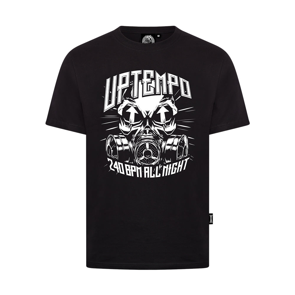 Detalles: Logotipo de Uptempo y diseño de máscara de gas, eslogan "240 BPM All Night", tela de algodón suave