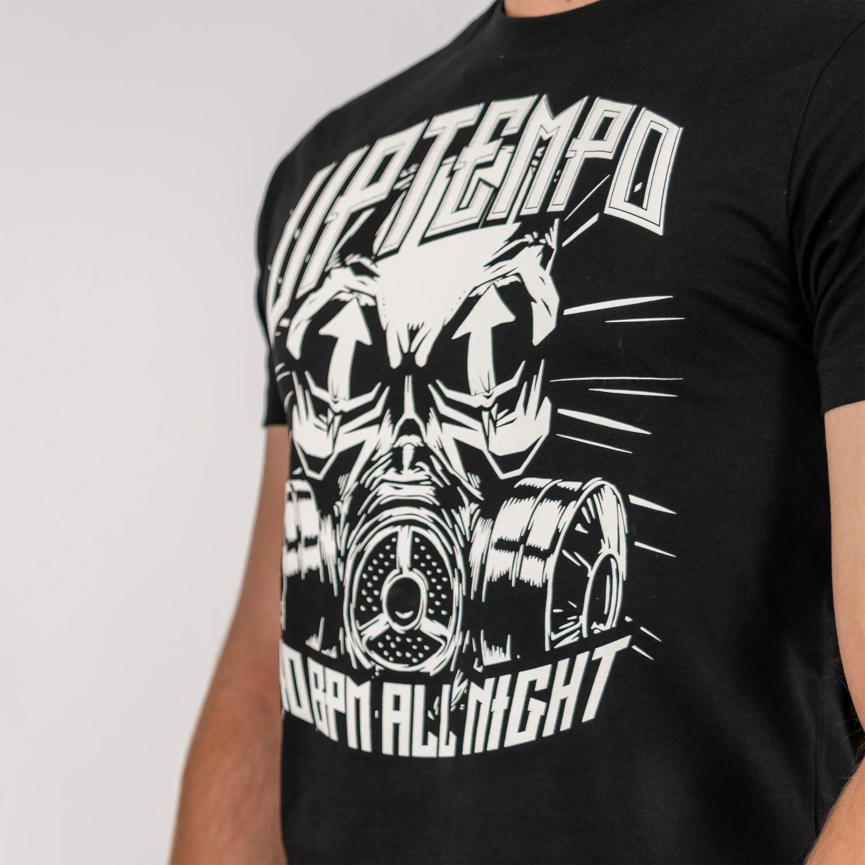 La camiseta Uptempo 240 BPM está diseñada para los verdaderos fanáticos del uptempo. El llamativo estampado frontal presenta un impactante diseño de máscara de gas con el texto "240 BPM All Night" , que representa la energía imparable de los estilos más duros.