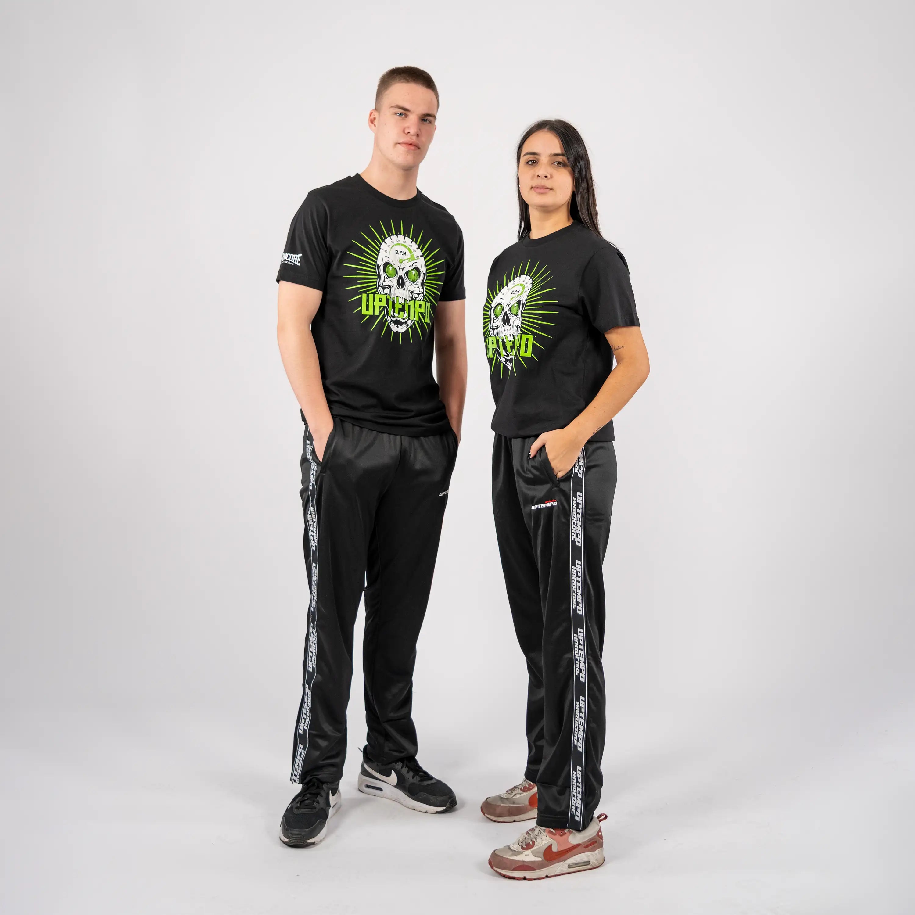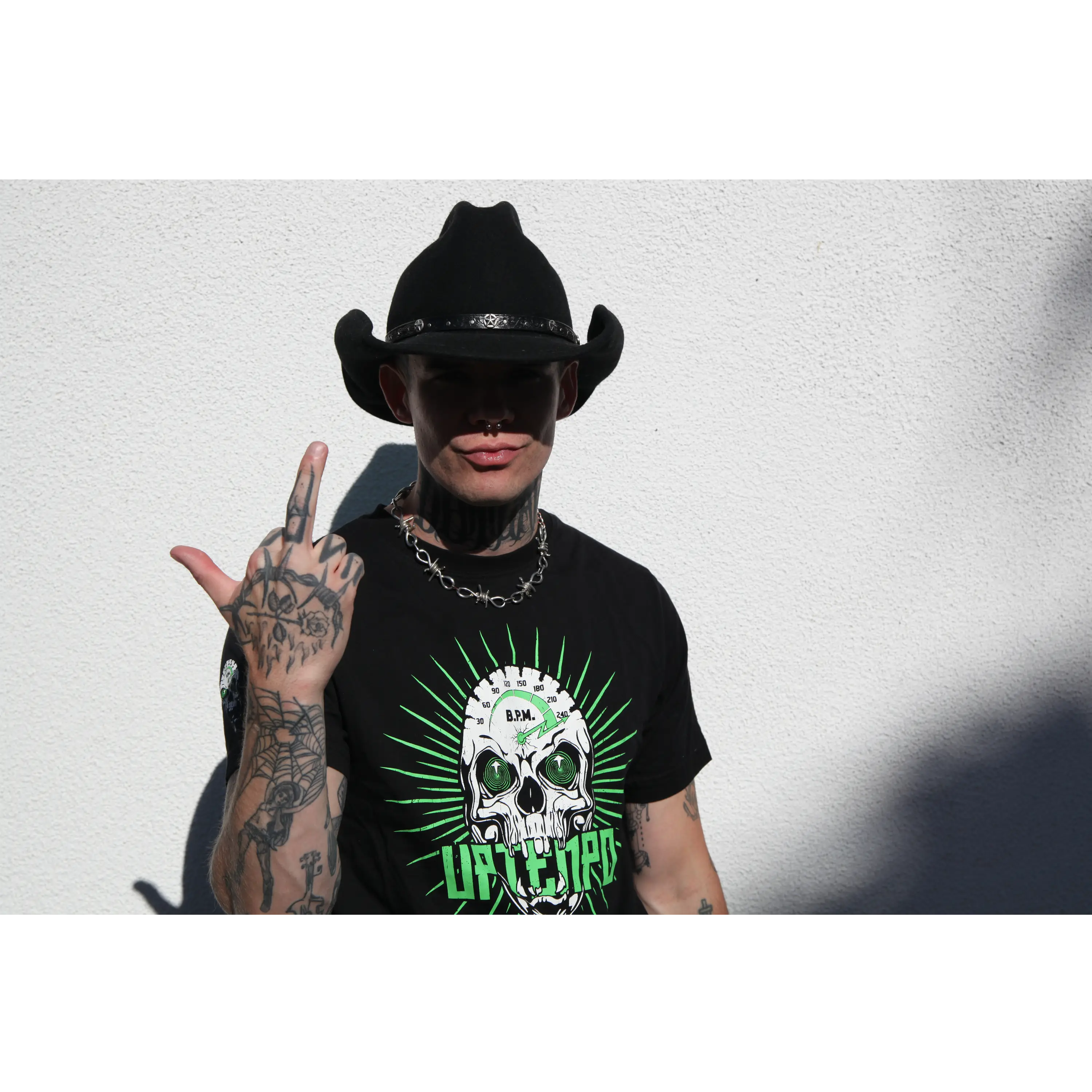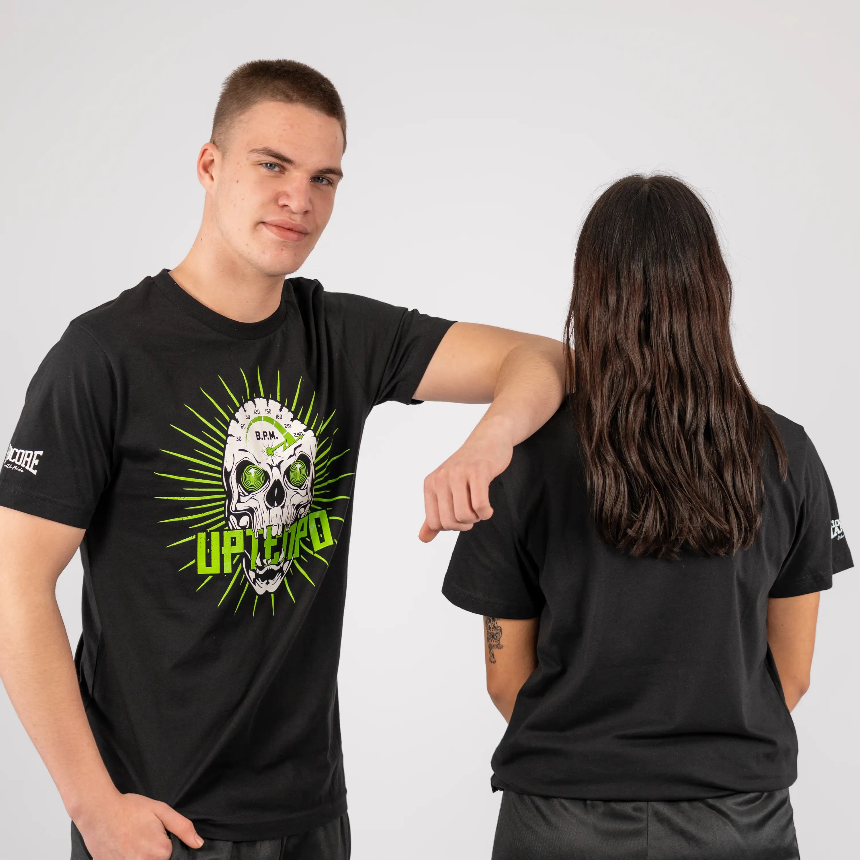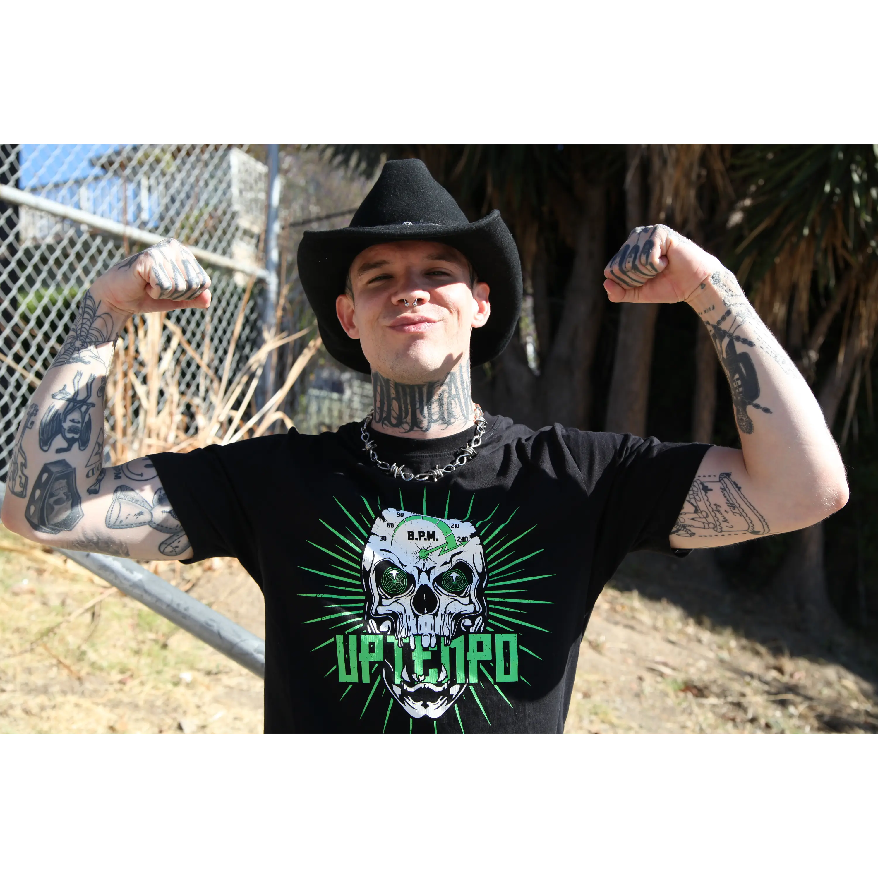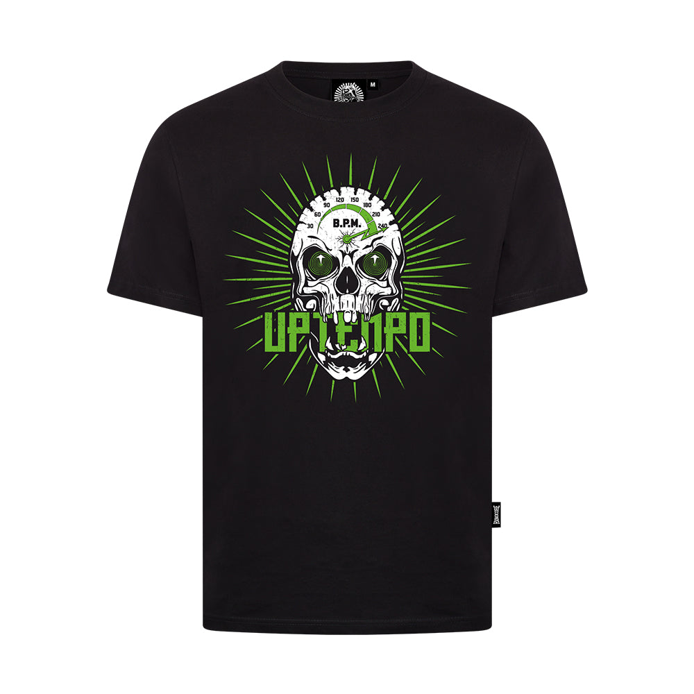 Detalles: Diseño de calavera con medidor de BPM, logotipo de Uptempo en verde neón, tela de algodón suave