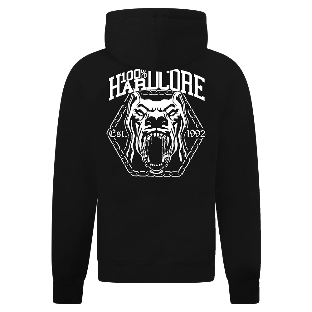 Kleine opdruk op de voorkant: 100% Hardcore logo met hondenembleem