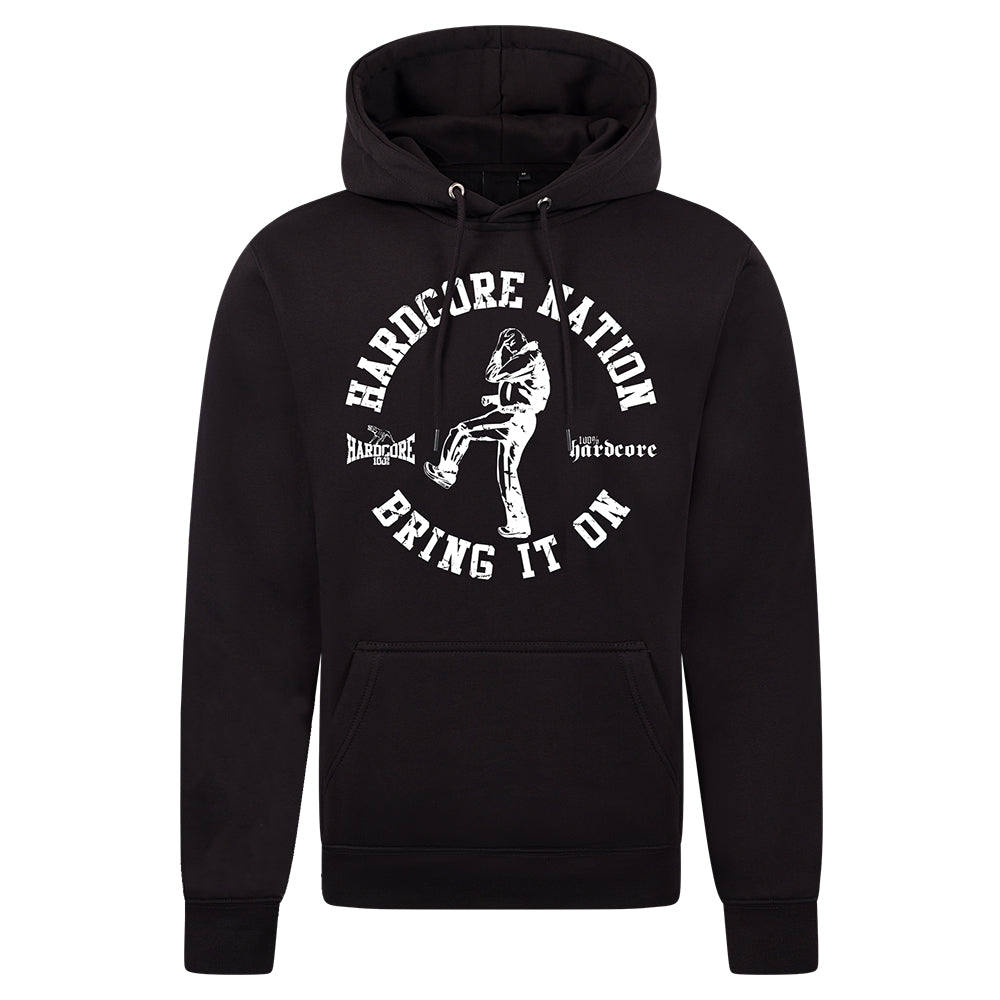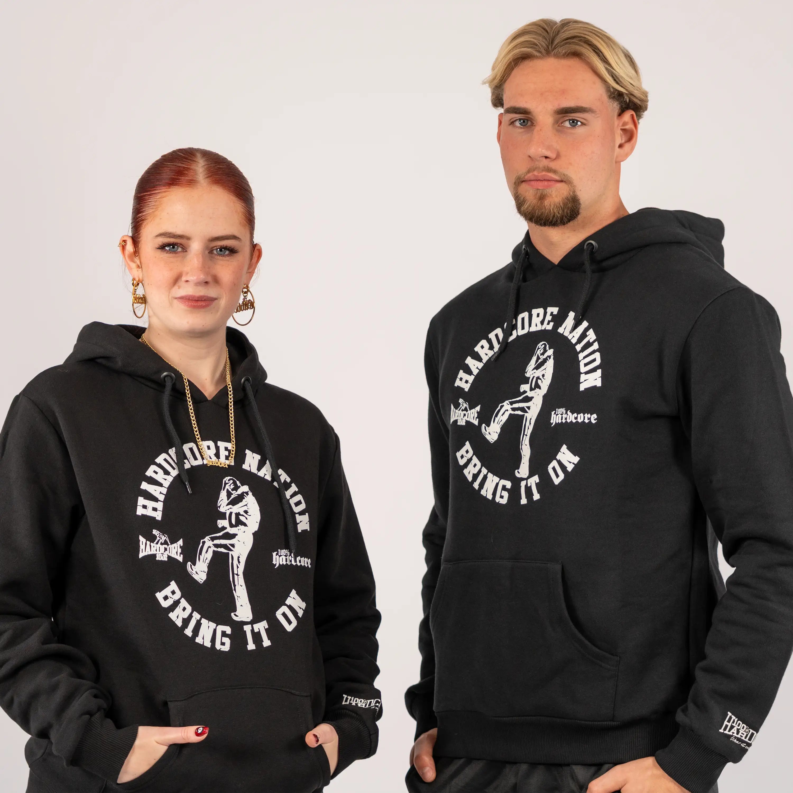 De 100% Hardcore Hoodie Bring It On legt de geest van de gabberbeweging vast: rauw, krachtig en vol energie. Met de opvallende print "Hardcore Nation – Bring It On" brengt deze hoodie een eerbetoon aan de oldschool roots van de scene.